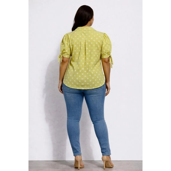 This plus size top features a classic polka dot print, a collared V neckline, and short puff sleeves with tie cuff details. Designed with a relaxed fit and softly rounded hem, it gives a playful polished look that works for brunch, casual outings, or everyday wear. The lightweight textured fabric adds airy comfort and gentle movement, making it a standout choice for easy feminine styling.